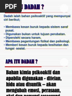 Penggunaan dadah ini dibuktikan menerusi penemuan catatan di batu berukir sumeria dari Mesopotamia. Pengawalan Dadah Antarabangsa Bangsa-Bangsa Bersatu UNDCP menyenaraikan Malaysia terletak ditempat kelima dirantau Asia Tenggara mempunyai bilangan penagih dadah paling ramai. Pendikan Pencegahan Dadah adakah tanggungjawab semua warga sekolah.